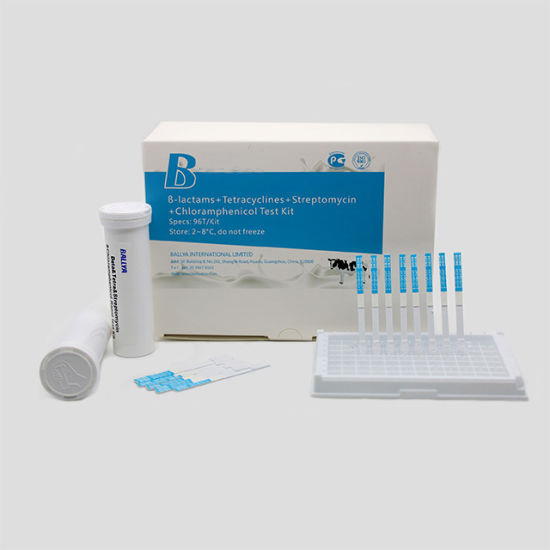 The Beta‐Lactams + Tetracyclines + Streptomycin + Chloramphenicol Test Kit is a colloidal gold immunochromatography assay that detects Beta‐lactams, Tetracyclines, Streptomycin and Chloramphenicol in raw milk, milk powder, pasteurized milk and meets EU MRL. This kit can be applied for on-site rapid testing by various departments.